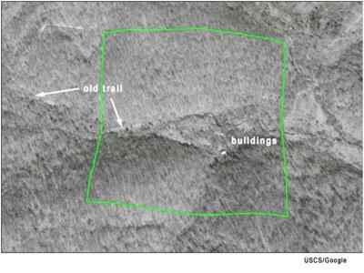 BELOW: This aerial view from 1995 sheds more light on the situation, literally, as the leafless trees allow us to see what appears to be an old trail coming in from the west. That’s not to say that there’s a legal easement, but it’s a nice start. Plus we see a couple of what appear to be abandoned buildings that may hint at an old well or other improvements.