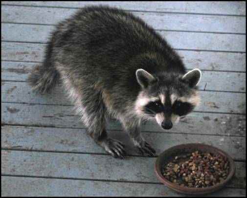 So I was startled, but not surprised, the other day when, coffee cup in hand, I headed out the door to relax in my rocker, and there, just inches from the same puny little ankle that was raccoondalized those many years ago, was a young raccoon, chowing down on the cat food.