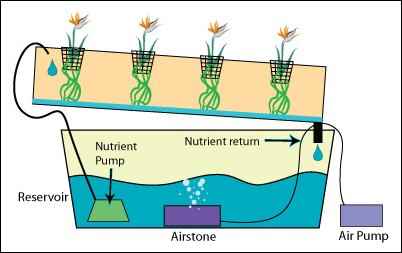 Nutrient Film Technique (NFT) uses a thin layer, or “film”, of nutrient solution flowing over the roots of the plants. All of the plant’s nutrient needs are met through the air and water solution washed through the plant’s root system. No growing medium is used, except for what is used for allowing the seed to germinate. The plants grow in channels, which are normally flat-bottomed runways cut into a slight “V” shape and positioned on a slope. The nutrient solution is fed at one end, following the slope, and drained back into the reservoir tank to be re-circulated. The root mat develops partly in the shallow stream of re-circulating solution and partly above it. This is an important balance to maintain, since the roots need adequate oxygen to survive.