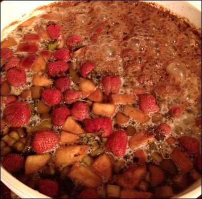 For my strawberry-rhubarb mead, I added 5 pounds of fresh rhubarb—two juiced and three chopped; and three pounds of fresh strawberries. I also cut up two medium-sized apples. Apples have large colonies of different yeasts living on their skins that can add some interesting flavors. I also like to add lemon and lime juice to my must. This serves two purposes. First, yeast converts sugar to alcohol at a more efficient rate in an acidic environment. Second, the acidity helps lend balance to the sweetness of the honey. Lastly, I added the bit of clover honey I used to compare with the wild honey because, well, waste not, want not.