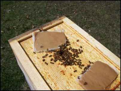 Last resort feeding is to put sugar on the inner cover surrounding the inner cover opening. Don’t make this a habit, plan ahead and get the food on the bees sooner.