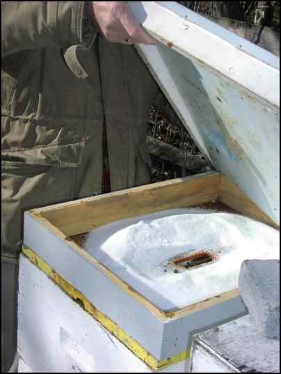 And one more thing: ventilation. All that warm air contains respiratory moisture. The moisture condenses when it comes in contact with the cold sides and inside top of the hive (like warm breath on a cold window). Condenses, collects, and then drips down on the bees. Cold, wet bees are unhappy bees. And pretty soon, dead bees. You have two choices: provide lots of ventilation so that warm air rises and exits the hive immediately, creating almost a gale inside the hive, but keeping the drips away, or, sealing it up so the warm air rises, but is trapped and isolated above the bees and beneath the cover—some beekeepers simply use batten insulation, or homosote board, or a super filled with straw or leaves—whatever it takes to hold the moisture so it doesn’t drip back on the bees.