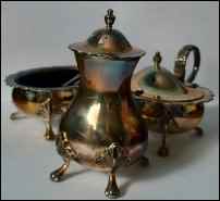 Silver Cleaner: Aluminum pan, boiling water, one tablespoon of baking soda, and one tablespoon of salt. Bring this mixture to boil in the pan. Drop your flatware into it as it boils, doing only a few pieces at a time. Let them boil for three minutes, then take them out and let them drain on a soft cloth, drying them to a shine with a second cloth. Do not overcrowd the pot–it can be confusing to remember which pieces have already done their three minutes and which ones still have time to go; also, it can lower the temperature of the liquid, thereby lowering its efficiency. Intricately patterned or pieces that are glued should probably be cleaned with a commercial cleaner. A minute layer of the silver is removed each time you use this method, however, the conventional method of polishing silver rubs off the same small layer.