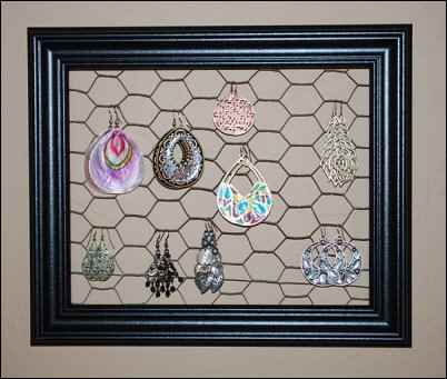 It seems most of my more useful re-born items come from outdoors. While raking away a bit of frost on Valentine’s Day this year to spread my leaf lettuce seeds, I unearthed a small portion of cut chicken-wire. It was filthy and covered in rust, but I have an intense aversion to wasting chicken wire (almost more so than food scraps.) So, in the garden bucket it went. When I got it back into the barn and cleaned it up, I chastised myself for picking it up at all. What on Earth was I going to do with a five inch by seven-inch scrap of chicken wire? And who cut a piece that small anyway? And why was it laying in the lettuce bed and not busy doing what it was cut for? Later that night the thing happened that always happens when a girl wants to look her best for a nice dinner in town. I couldn’t find the match to one of my pretty dangly earrings. The next day I spray painted that chicken wire and wrapped the edges around a fabric-covered 4″x6″ cardboard cut-out and slipped the concoction into a photo frame that had the glass broken out years ago. Brand new dangly-earring-holder and handy use for scrap wire all in one.