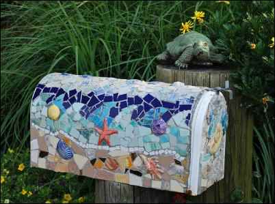 A Sunday drive through the country can supply all the repurposing inspiration you need if there are items laying unemployed around the homestead. For example, you will find at least one antique farm implement transformed into a stylish and functional replacement for a standard, boring old mailbox post. Rural dwellers can be quite creative when it comes to mailbox décor. Old driftwood, antler sheds, or metal pipes can adorn the post; I once saw a box and post covered entirely in marbles. Seashells and stones are popular as well. Another old standby is mosaic, which can be made out of old broken colored glass, dishware, or extra tile. Another common theme is climbing flowers or ivy, but there is a different way to add a living element to your curbside mail receptacle while using what would otherwise go out with the rubbish. The best way to do this I’ve seen is by using self-tapping screws to attach a plain old metal mailbox to the top of a bent-and-not-so-sturdy-anymore galvanized or painted metal step ladder, and then adding potted plants to the steps on each side. I saw one once with Minutemen Hostas planted all around the base and every color imaginable in the flowers stepping up to the box.