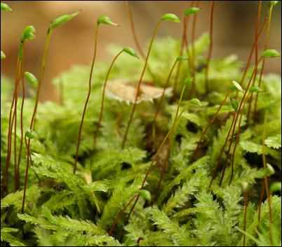 Moss doesn’t have roots for absorbing water, but it does have rhizoids that anchor it to whatever substrate it grows on. It soaks up water like a sponge through the small, simple-shaped, ribbed leaves on each tiny stem. It needs some sun, but can’t deal with more than an hour or two per day, and it grows on rocks and ground. Moss is able to absorb pollutants such as nitrates and ammonia, as well as humidity and nutrients directly from the air. In fact, scientists are discovering that they can examine moss to determine how much pollution is in the air.