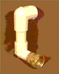 7. Screw the brass swivel connector to the threaded end of the street elbow connector. The swivel connector will be the “interface,” if you will, to the garden hose that supplies the water. Here’s how the back assembly should look: