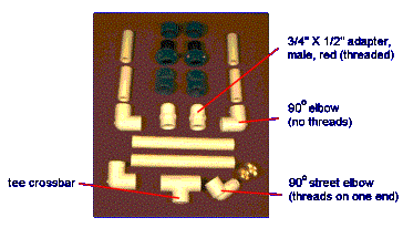 Go to a home center or hardware store and get a length of half-inch PVC pipe. (The standard length is ten feet.) While you’re there, grab a tee connector, three 90° elbow connectors, one 90º street elbow (threaded on one end) two ½-inch threaded male adapters (“red” may appear in the part description), two hose end caps, and a brass ¾-inch hose connector. You’ll also need small cans of primer cleaner and PVC cement. A parts list appears at the end of this article, but here’s what they look like: