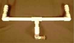 1. Find the the ½-inch, 90º, street elbow connector at the bottom of the back assembly, the one to which you’ll attach the garden hose. Substitute a tee connector for that threaded elbow connector, gluing the tee connector at one of the ‘crossbars’ of the tee. Aim the tee’s ‘upright’ toward your garden hose.