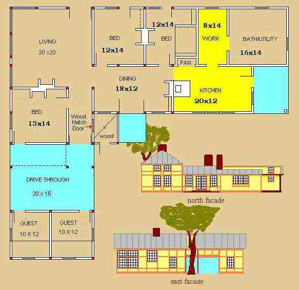 Once we bought the shed and built that first addition, the plans began to shape themselves around the existing building. I discovered that I wasn’t allowed to build under the power lines, which meant I couldn’t build to the south. All through the winter of 2000, I worked on variations of one l shaped plan that would give us 3 good bedrooms, a dining room, as well as a great room for living and entertaining. I also wanted to put the bathroom and kitchen in one area to save on plumbing. I intended to heat the whole place with fireplaces. There were also provisions for a guest building, a drive through loggia (a sort of glorified carport), and a separate room for all my dogs.