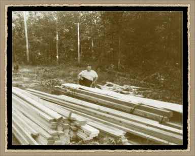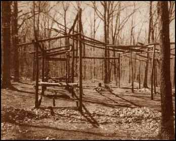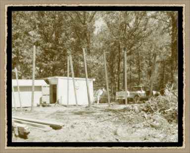 We bought that first parcel sight unseen and the next March, we finally went down to look at it. Even in the gray of early spring, I could see how nice it was, and as luck would have it, Neil had 6 more acres across the lane for sale, so we bought that too. The new parcel came complete with an electric pole, an outhouse and shed and the log frame of a pole barn courtesy of the previous owner. All this was set in a nice shady clearing and we decided that this was where we would build our house. That old pole frame made a dandy arbor and we set up camp there with a nice fire ring and a few comforts and we started to make our plans and begin our improvements.