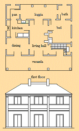 This is the plan we are working with now. It’s not engraved in stone, but the finished house won’t be too different. We did get one surprise when we came to lay it out: there was one tree in the way, a really nice big oak that is, unfortunately, right in the loggia area. After a little head-scratching, we decided to be a bit unorthodox and just build around the tree. When we get around to building the loggia wing next year, that tree will continue to grow where it is, undisturbed. We will lose a bit of the space in the upper story, but it does create a neat sort of hanging hallway lined with windows. We figure the tree can serve double duty as a sort of fire escape for those upper story guest rooms. The great room will be about 12 feet tall and, pretty much, lined with windows. We designed that big corner bay so we would have a place to put a huge Christmas tree that could be seen from the road, not that Sappington Lane gets much traffic. The public rooms will have sun most of the day and the dining room and kitchen will stay fairly cool on the north side. The courtyard formed by the two wings is shaded by two big oak trees and leads to the old log pole arbor. There’s also a handy little wood room so we don’t have to go out in the winter.