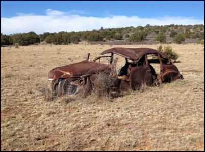 In the Panhandle region, Donnie and I saw great stretches of implacably harsh scrub, utterly flat (to our foothills mindset) plains of brown dirt. Everywhere we went on our search for the Henderson homestead, we saw wrecked and abandoned homes, barns, and vehicles.