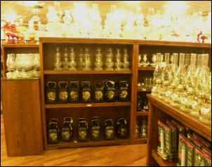 The lighting room is a dazzling arcade that combines the homey beauty of brass bases and finials with the multi-colored charm of floral glass shades. On the practical end are carbide lamps (made in India), wind-up flashlights and candle lanterns. While at the store I bought two adorable hand-painted lampshades not advertised in the catalog. This points up another reason to go to Kidron: to see the goods particular to the Amish trade that are not included in the catalog, such as the wide variety of buggy lamps.