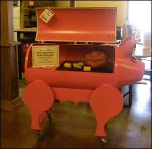 The stove room is vast and warm, with antique models on the highest shelves and new but antique-looking models at floor level. Though Mennonites are plain of dress, they seem not to mind an overdose of ornamentation in the parlor or kitchen, as the sensually gilded wood-burning stoves suggest. Cookstoves feature a myriad of color and trim options, allowing you to pay well over $6,000 if that is your worldly desire. But there are also the least decorative and most practical versions for the thrifty and the modest, right down to the “barrel stove kit”—a stacking model in cheery red runs just a little over $100. And it was in the stove room that we encountered the pink pig barbecue cooker, truly a must-have for someone!