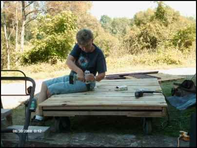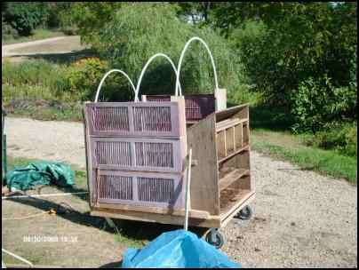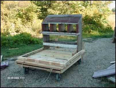 The agenda for Day Two centered on building the moveable coop. Keep in mind, we’ve only been on our place for a year, so we didn’t even have all the tools that we needed for the job. And we always have more ambition than expendable income, so we went bargain hunting. At a second-hand store in town, we found a great power saw. It serves a dual purpose: cutting lumber and cutting out Ruth’s whining, “If I only had a saw.” Then we went to our favorite retired farmer/collector and bought a roost, as well as some vinyl house shutters and an old kitchen cabinet door to make the sides of our coop. In another second-hand store, we found four wheels so we could “easily” move our coop around the property. Finally, we went out behind the lumberyard and picked up free pallets for the floor and framing. The only new items we purchased were a box of screws and three pieces of PVC… and more of the steel posts and fence wire that we had used to rabbit-proof our garden. By the time we got home to start construction, it was time to gather eggs… two of them, current investment: about $200 each. But it was all very exciting.