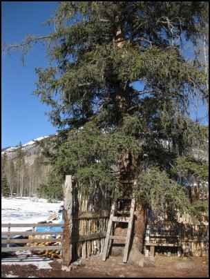 Tree. The old spruce tree that my husband’s grandfather used to use to hang his saddle from, on one of the lower branches. It’s the largest tree on our ranch, a big old Blue Spruce, gnarly from years of being used as a natural firewood storage shed and fence corner post. Up in this tree, our son built himself a tree house years ago, far too high for me to visit. Foals have slept under the shade of the tree in spring, and many a picnic under there in the summer.