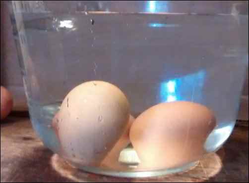 Fresh Eggs: With free-range chickens, we are sometimes surprised when we come across a hidden nest of eggs. If you have ever had the unpleasant experience of cracking a rotten egg into a skillet, you understand the importance of testing eggs for freshness. Fill a pitcher with water and gently put your eggs in the pitcher. A very fresh egg will sink to the bottom and lay on its side. If the egg sinks to the bottom but its fat end rises up slightly, your egg is about a week old. Any eggs that float are bad and should be discarded.