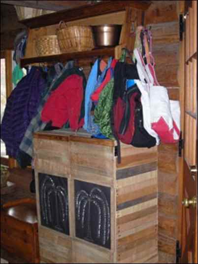 Because we do not have a coat closet, a shelf that was made from recycled boards from an old house, and antique nails turned into hooks, serves as a coat rack and storage area. Baskets on the shelves hold various objects that we use. Apple crates from my husband’s family farm fitted with curtains act as other storage units on which sit our TV and printer.