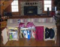 Some of our favorite pieces of furniture were created by my family and friends. These pieces of furniture serve many purposes or help to create storage space. Our couch separates our living room from our kitchen. Behind it we placed a piece of furniture that we made out of packing cases from a library and discarded boards from a local sawmill. It serves as an organizing area for the mail, a laundry folding table, a place to put our drinks when we sit on the couch, a storage unit for our laptop, and portable DVD player, our family board games, and our homeschooling materials.