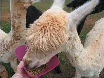 At last came the part of the tour of the farm, where patrons get to mingle slowly and carefully around the alpacas, feed them grain from a bowl and stroke their chins. “They are like cats,” Martinelli noted before turning us loose on the adorable creatures. “You must walk very slowly, and let them come to you. They don’t like to be patted on the head, but they enjoy having their chins rubbed.”