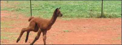 They have been recently shorn, but still, wear moppets of hair on their heads. Some have long bangs in their eyes like punk rockers and others appear to wear curly wool caps. They have regal sounding names like “Colossus, Son of Accoyo Caligula” and “Revolution, Son of Tiago, Grandson of Sinopsis, Danko and Yokon.” There is one albino in the group, a rarity who draws attention by batting pretty blue eyes. And while most casually strut around grazing or curiously looking at visitors to the farm, one little brown alpaca, born only this morning, is racing around amongst them as if he’s in a barrel race with an imaginary friend. It’s obvious that this little guy was probably quite the kicker while in his mother’s womb, just dying to get out and stretch his legs and run, run, run. Why we humans don’t catch on so quickly is beyond me, but Robbin Martinelli has the answer; “In the wild they have to be ready to run to protect themselves from danger,” she said.