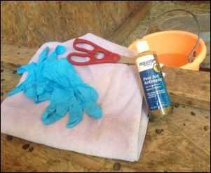 To help with birthing you will need a “kit.” The kit should include: iodine, latex gloves, towels, floss, and scissors. The scissors are used to cut the umbilical cord, if necessary (it has never been necessary for me). The iodine is there to treat the umbilical wound on the kid and keep it from getting infected. The gloves and towels are there for obvious reasons. The floss is there to assist in birthing in complicated births.