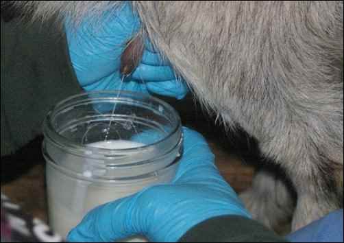 My wife wears latex gloves when milking in order to keep her hands from smelling like goat. The exact process for milking is as follows: