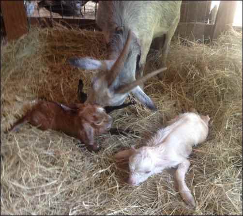 You will be amazed at how fast these goats get moving around. They will be following mom around within hours of birth, and by day two they will seem like they’ve aged a month. The kids in the picture were just born minutes before. The white one was born first, which is why it’s cleaner.
