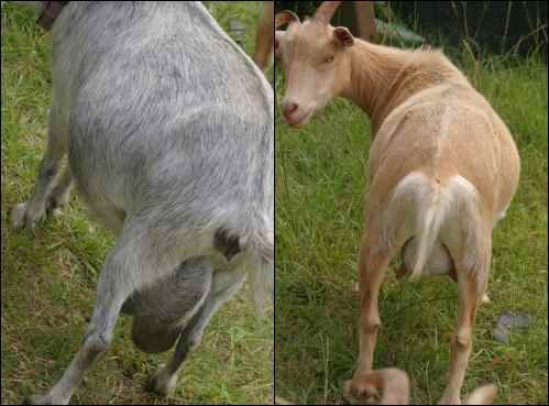 You want a goat with great udders. What does that mean? Firm, strong, balanced udders with good teat development will make for a great milk-goat. In the picture, you can see that the tan goat’s got it goin’ on, and she knows it. The gray goat is a great mother and a wonderful goat, but she has bad udder development. Her udders almost drag on the ground; they have actually been cut and scraped when she climbs over things.
