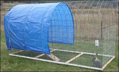 Rabbits are very sensitive to heat, so they must be provided with shade and plenty of ventilation. In the summer, we wrap a heavy duty tarp over the arched cattle panels, but only above the platform. Make sure it reaches down past the platform to keep the plywood dry and provide shelter from rain. In the winter, attach another tarp to the back end and they will stay snug and warm in cold weather.