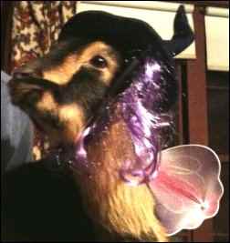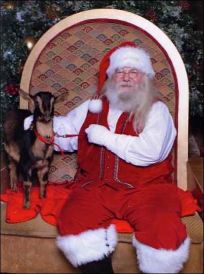To cheer ourselves up, Chris and I decided to do something characteristically unconventional. The local Very Posh and Ritzy Mall had a pet night at their “Photos with Santa” stand. None of the advertising said anything about “pets” being restricted to dogs and cats. So, to get out of the gloom and doom of poverty and the uncertainty about our house, we bundled Sandy (and her new poinsettia-festooned holiday collar) into the VW and trudged off to the mall. Never have I seen so many delighted folks in my life as we paraded our little goat past the high-end retailers that we could never afford even if we wanted to (which we didn’t). Sandy was so proud of herself that she practically glowed. Even the normally disgruntled “elves” at the photo booth were enchanted. Santa was a good sport and posed dutifully with Sandy for her picture. Our friends and relatives still hold that snapshot as being the essence of our insanity.