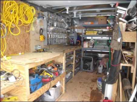 An electrician I know helped me run lighting and electrical outlets throughout the truck. These do not run off the truck battery but rather I plug the truck into a house outlet or generator to power up the workshop portion of the truck. This setup allows me to work while standing inside the truck, which really comes in handy during rainy weather. I can run the power tools as well as recharge the cordless tools while working inside the covered workshop.