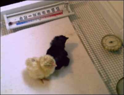 Let the chicks tell you how much heat they need. If they move as far from the heat as they can, it’s too hot. If they’re piled up, or huddled together, they’re too cold. If they’re scattered more or less evenly, they’re just right. Adjust the heat by raising or lowering the lamps, and by draping towels over the rest of the screen to hold more heat in.