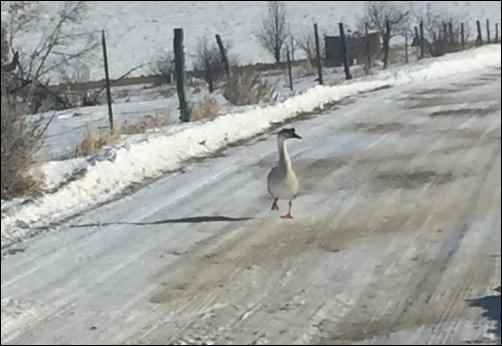 In December, a few days before Christmas an elderly neighbor couple called me and asked if I lost a goose. They said a stray and hungry-looking goose was hanging around their house. Our geese were accounted for so I told them that and I thought that was the end of it. A couple of days later, a stray goose walked up our road. It was a Chinese goose, though not white like our two. I assumed it was the same one that they had called about. It was skinny and looking hungry, trying to forage for grass under the snow.