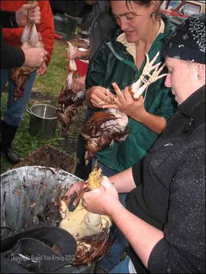 Pretty soon the students are getting the feel for the kill, bleeding out the birds and beginning the de-feathering process of dunking the chickens in a big vat of boiled water, pulling the tail feathers first, then pulling heaping handfuls into the garbage can until it looks like, well, a bloody rubber chicken.