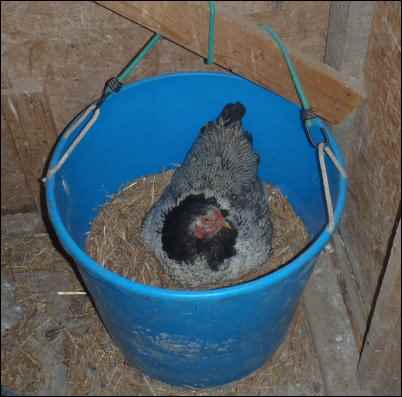 If you have a separate area for your broodies, you can cover the floor with a deep layer of straw or other bedding, form depressions in the straw, and nest them right on the floor. I like to have the nests in a tub or box of some sort, but that’s just my preference. I have several tubs like the one shown below, that I can add or remove as needed. I like these because I can put deep bedding in them, so the hens can’t scratch it aside down to a hard surface where the eggs will get broken. You can use any sort of container for a nest, as long as it’s big enough for the hen to comfortably move around, deep enough to keep her from scratching to the bottom when re-arranging the bedding. Any nest should be anchored or supported in some way that will prevent it being tipped over. In this case, I drilled holes in the rim to put rope handles in, knotted on the underside of the rim, and attached it to that two-by-four with a bungee cord. A couple of well-placed nails in the walls to anchor to would work just as well.